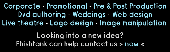 Phishtank Productions is an innovative Media & Multimedia company based in Liverpool. This company is run and produced by James Traynor who has 10 years Professional Media Production, Multimedia image and web design experience. The company’s aim is to be at the forefront of new and competitive ideas and design development pushing out into the world of New Media. The company has been commissioned by a wide range of clients looking for new and inventive mediums to advertise and promote their companies or ideas in. Throughout this site you will be able to view examples of past, present and future work produced by Phishtank. This work compiles of a wide range of examples; Full video production projects. Post-Production editing within multiple formats. DVD Authoring, navigation design & archive video. Online Multimedia web-design & animation. Digital image design & manipulation including Photo Video slide shows. Please contact me about any comments, ideas or events you would like to commission... or please see my full CV of past and present work for more details and examples of work.